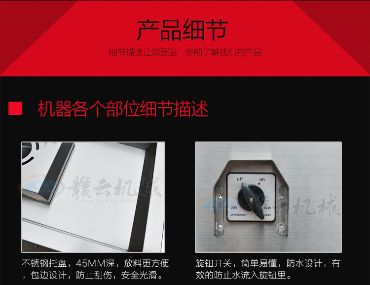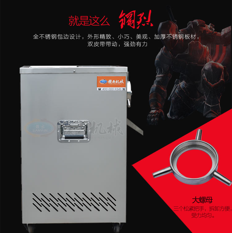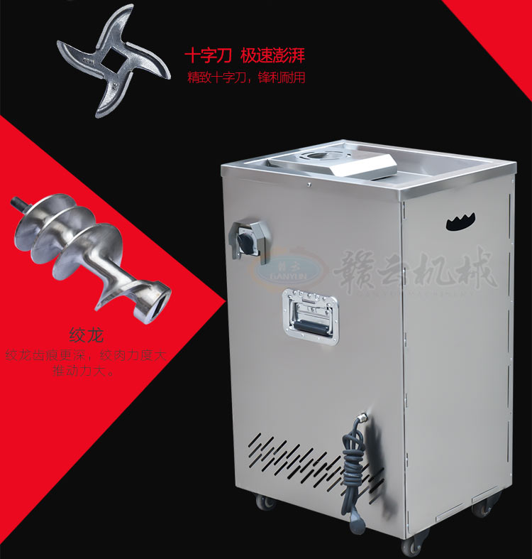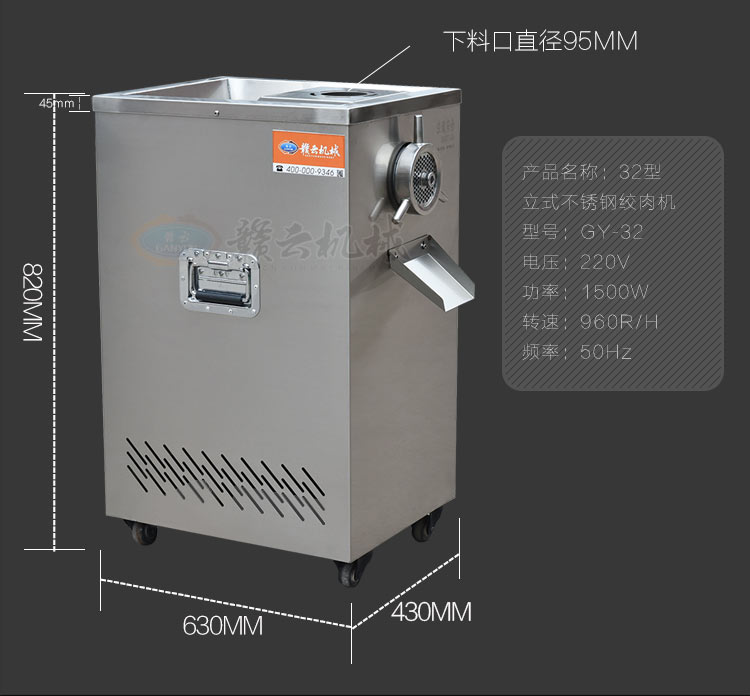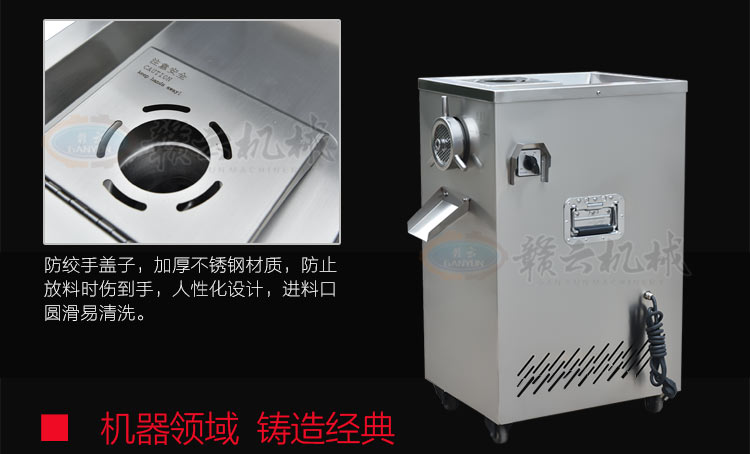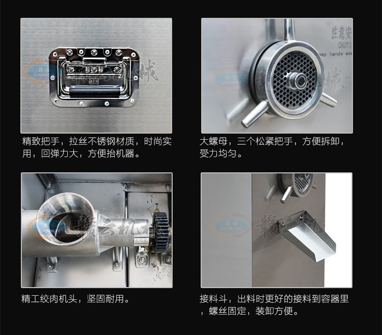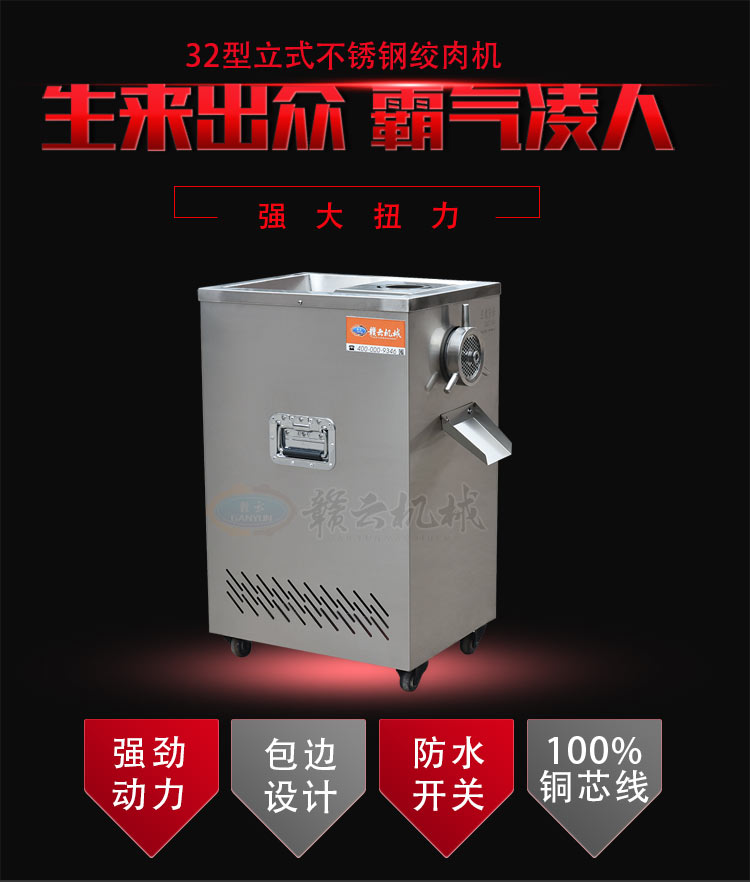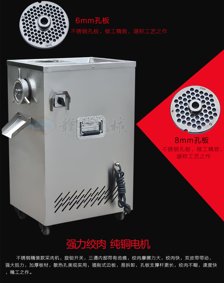 32型立式不銹鋼絞肉機(新),不銹鋼精裝款采肉機,旋鈕開關(guān),三通內(nèi)部帶有齒痕,絞肉摩擦力大,絞肉快,雙皮帶帶動,強大扭力,加厚板材,散熱孔美觀實用,插銷式邊板支撐桿更長,絞肉不糊,速度快,精工之作。